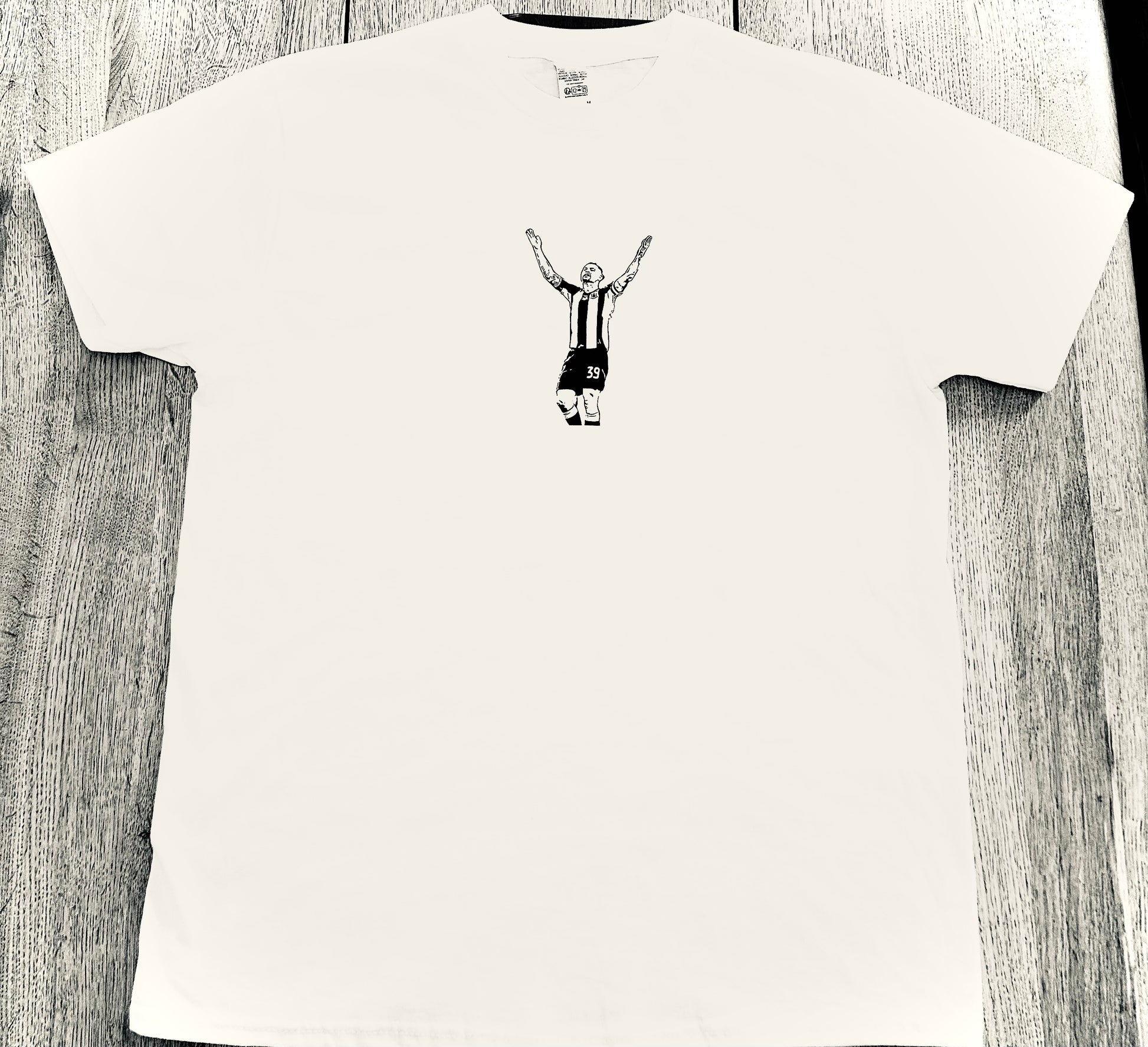 The Bruno Guimarães T-shirt, part of The Club Shop's Victory catalogue. Bruno Guimarães has become a cult hero on Tyneside, as the engine room of a Newcastle team that went from Steve Bruce and survival to Eddie Howe and the Champions League. Bruno captures of the essence on the pitch of what it means to be a Geordie, and here we encapsulate his moment of solitary celebration on the Wembley pitch.